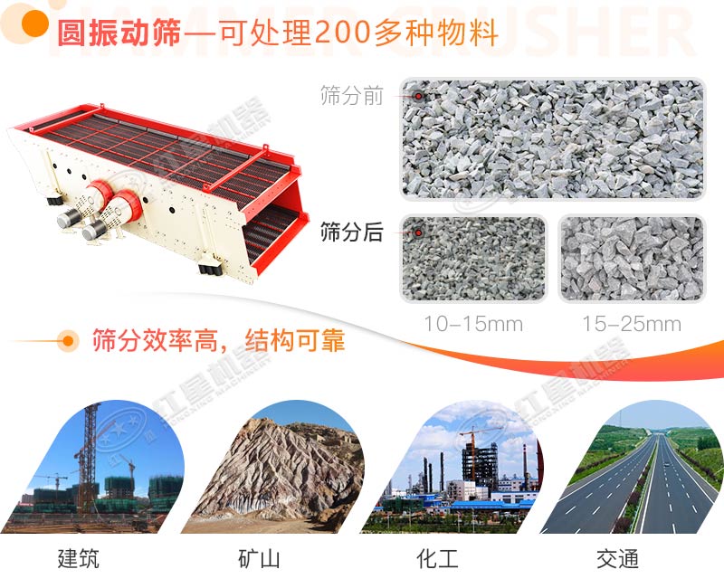 圓振動(dòng)篩圓振動(dòng)篩是一種做圓形振動(dòng)、多層數(shù)、新型振動(dòng)篩。圓振動(dòng)篩采用筒體式偏心軸激振器及偏塊調(diào)節(jié)振幅,物料篩淌線(xiàn)長(zhǎng),篩分規(guī)格多,具有結(jié)構(gòu)可靠、激振力強(qiáng)、篩分效率高、振動(dòng)噪音小、堅(jiān)固耐用、維修方便、使用安全等特點(diǎn),該振動(dòng)篩廣泛應(yīng)用于礦山、建材、交通、能源、化工等行業(yè)的產(chǎn)品分級(jí)。